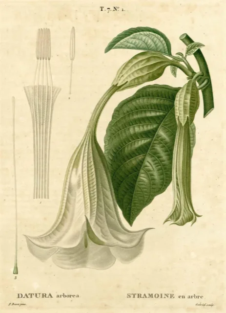 Estas flores tienen una forma de trompeta o campana, son péndulas (cuelgan hacia abajo) y poseen una corola gamopétala, lo que significa que los pétalos están fusionados en la base. En sus ejemplares silvestres, el color predominante es el blanco, aunque existen cultivares de jardinería en tonos amarillos o rosados. El sistema reproductivo incluye un gineceo con un ovario súpero bilocular y un estilo rematado en un estigma grueso. El fruto es una cápsula lisa que se abre por la parte superior al madurar, liberando semillas. Sus raíces son robustas para sostener el peso del arbusto.