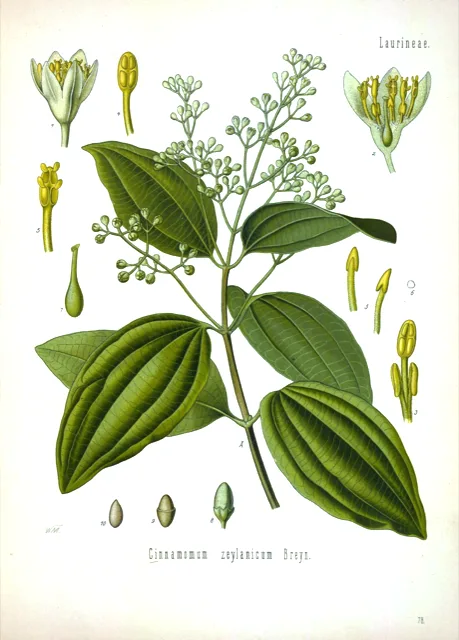 La Canela de Ceilán (Cinnamomum verum) es un árbol de hoja perenne que, en su estado natural, puede alcanzar una altura de entre 10 y 15 metros, aunque en entornos de cultivo suele mantenerse como un arbusto frondoso de unos 3 metros. Su estructura es leñosa y robusta. Las hojas son una de sus características más distintivas: presentan una forma ovalada con puntas agudas, poseen un color verde brillante en su cara superior y muestran un patrón de nervaduras muy particular, con cinco nervios principales (uno central y dos a cada lado) que se curvan hacia el ápice.