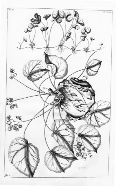 Sus hojas son su rasgo más distintivo: son de un color verde intenso, con una forma reniforme, lo que significa que tienen forma de riñón, con los bordes redondeados y un ápice también redondeado. Estas hojas poseen una textura suave al tacto, pero si las observa de cerca, podrá notar vasos marcados en su superficie. Las hojas nacen de peciolos largos, de aproximadamente 2 decímetros de longitud, que las elevan ligeramente desde el suelo.