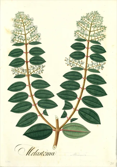 Sus hojas son uno de sus rasgos más distintivos: se presentan de forma opuesta a lo largo del tallo, con una morfología elíptica u ovada que puede alcanzar los 15 a 20 centímetros de longitud. Un detalle botánico fundamental es su venación longitudinal, donde varias venas prominentes recorren la lámina foliar desde la base hasta el ápice, un carácter diagnóstico de la familia Melastomataceae. Las flores son de un color rosa intenso o magenta vibrante, agrupadas en racimos terminales que atraen a diversos polinizadores.