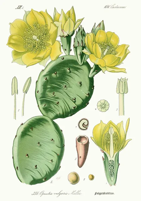 Los frutos, conocidos comúnmente como tunas, son bayas carnosas de forma ovoide que varían en color desde el verde hasta el rojo intenso o púrpura, conteniendo numerosas semillas pequeñas, duras y de color oscuro. El sistema radicular es superficial pero extenso, lo que le permite captar rápidamente la humedad de lluvias ligeras. Esta planta prospera en climas áridos y semiáridos, encontrándose en regiones de gran altitud, desde el nivel del mar hasta los 3500 metros sobre el nivel del mar en zonas de costa y montaña.